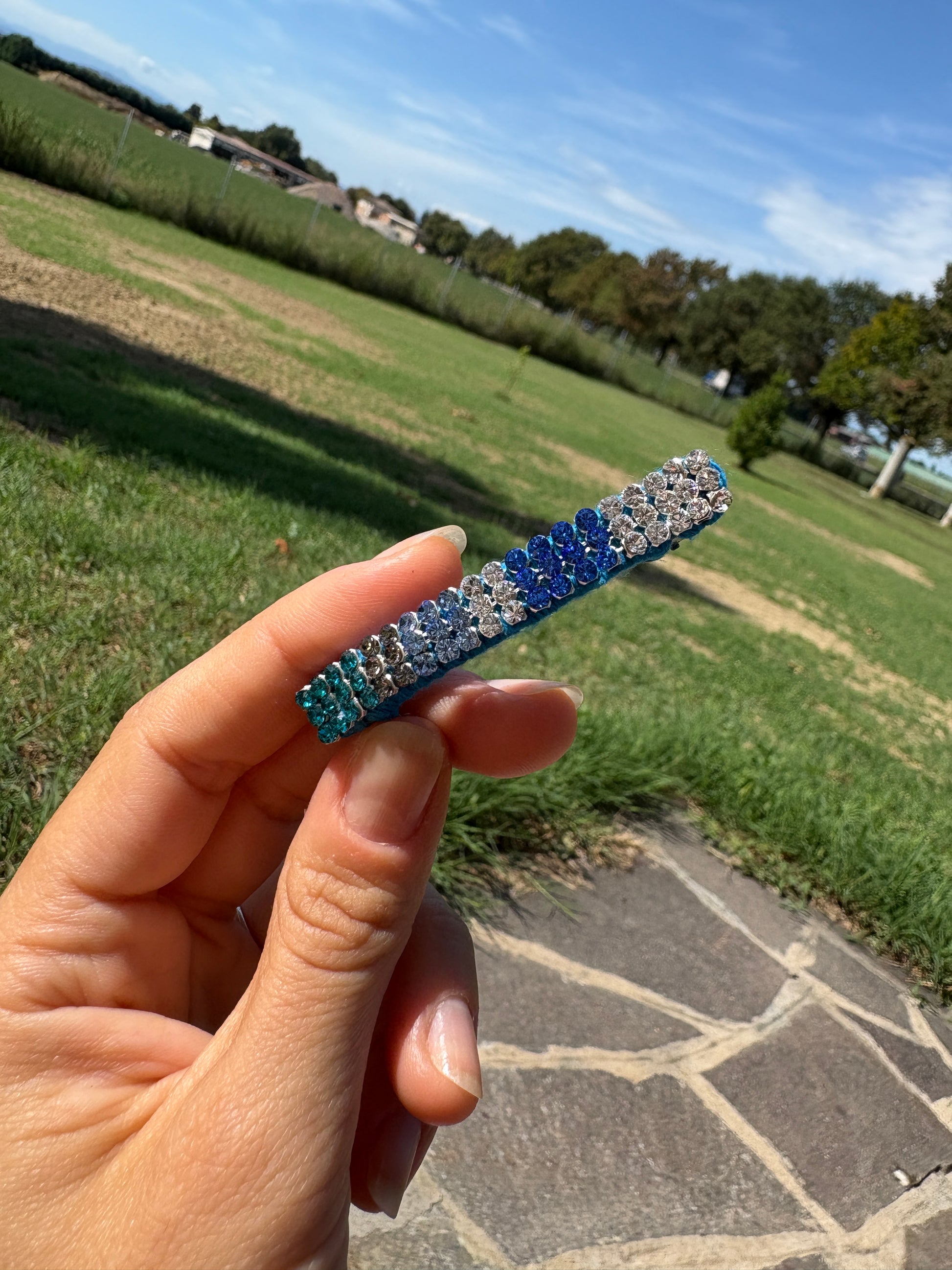 Catena di strass sui toni dell'acqua cucita a mano su fermaglio